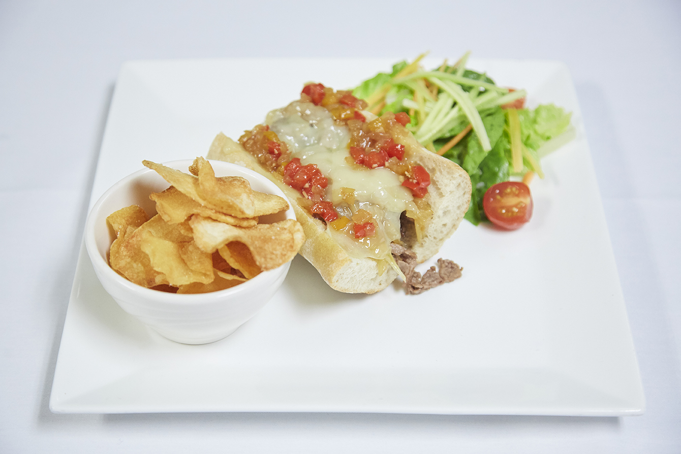 Place steak, caramelized onions, and red pepper jam on baguette.