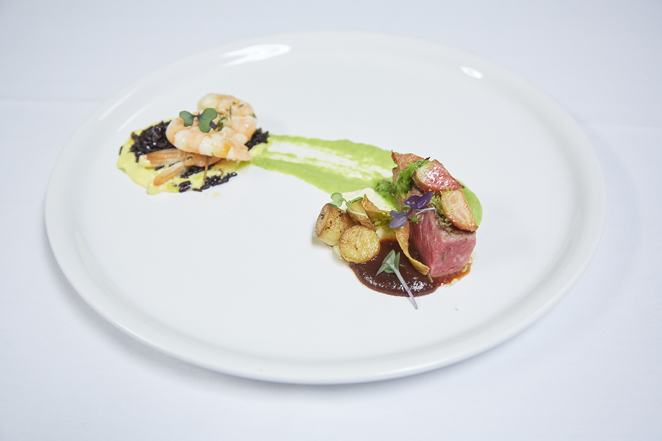 Place sliced steak on “star” end of asparagus puree.